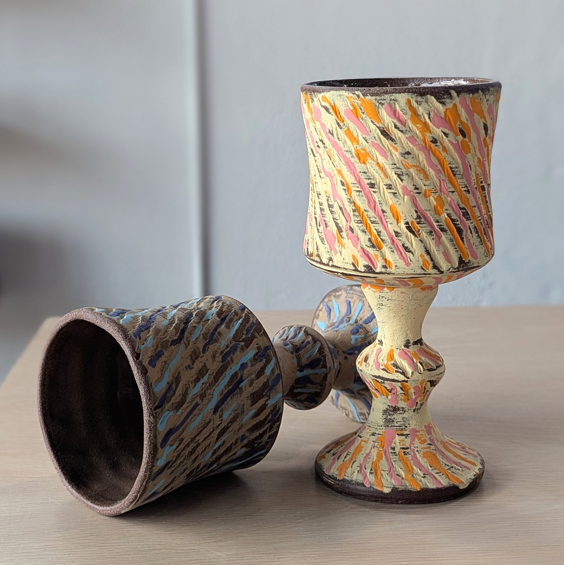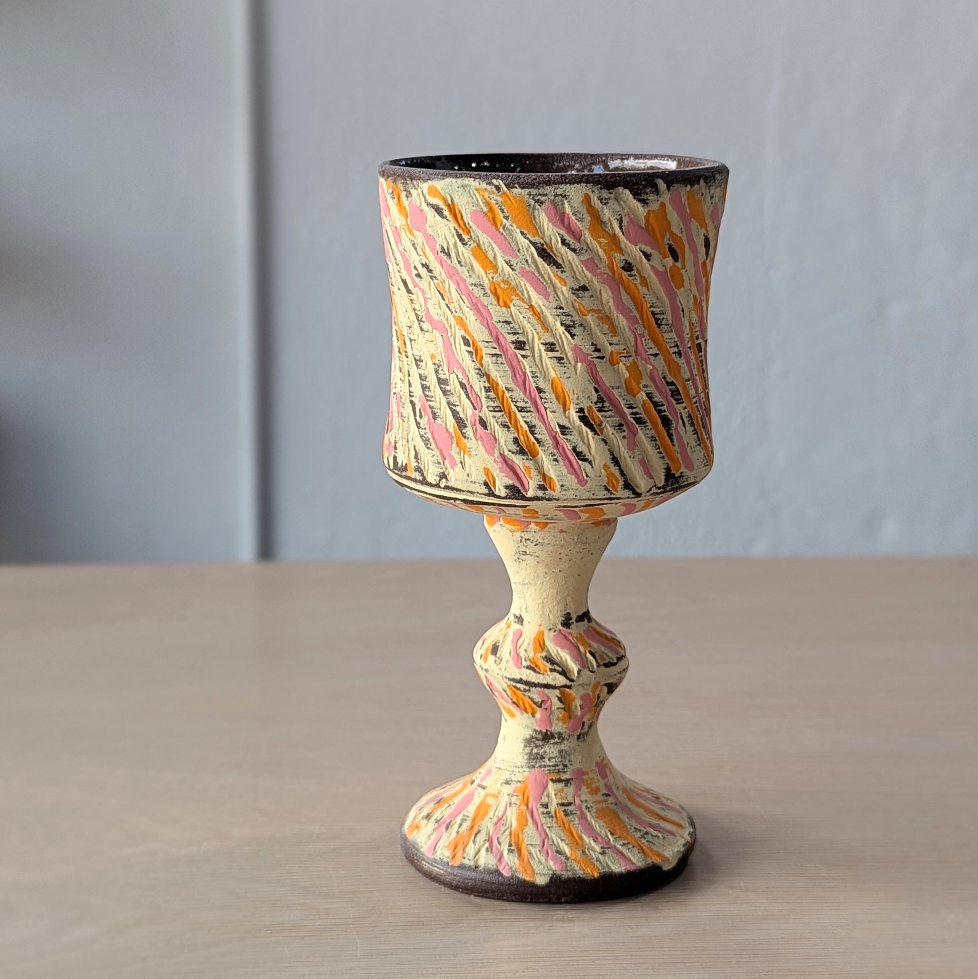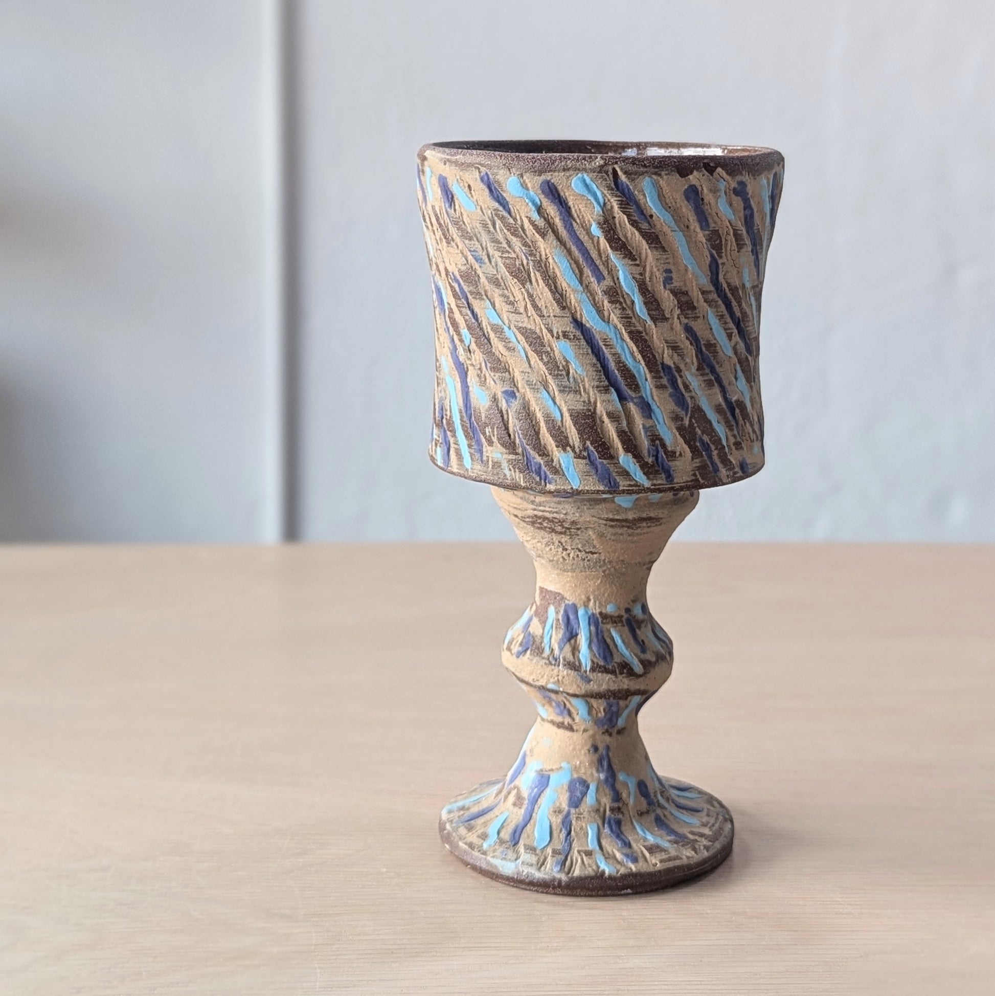 This hand-thrown and hand-built chalice undergoes several rounds of glazing and firing to achieve its complex depth and texture. Enjoy with wine, juice, or your favorite beverage.