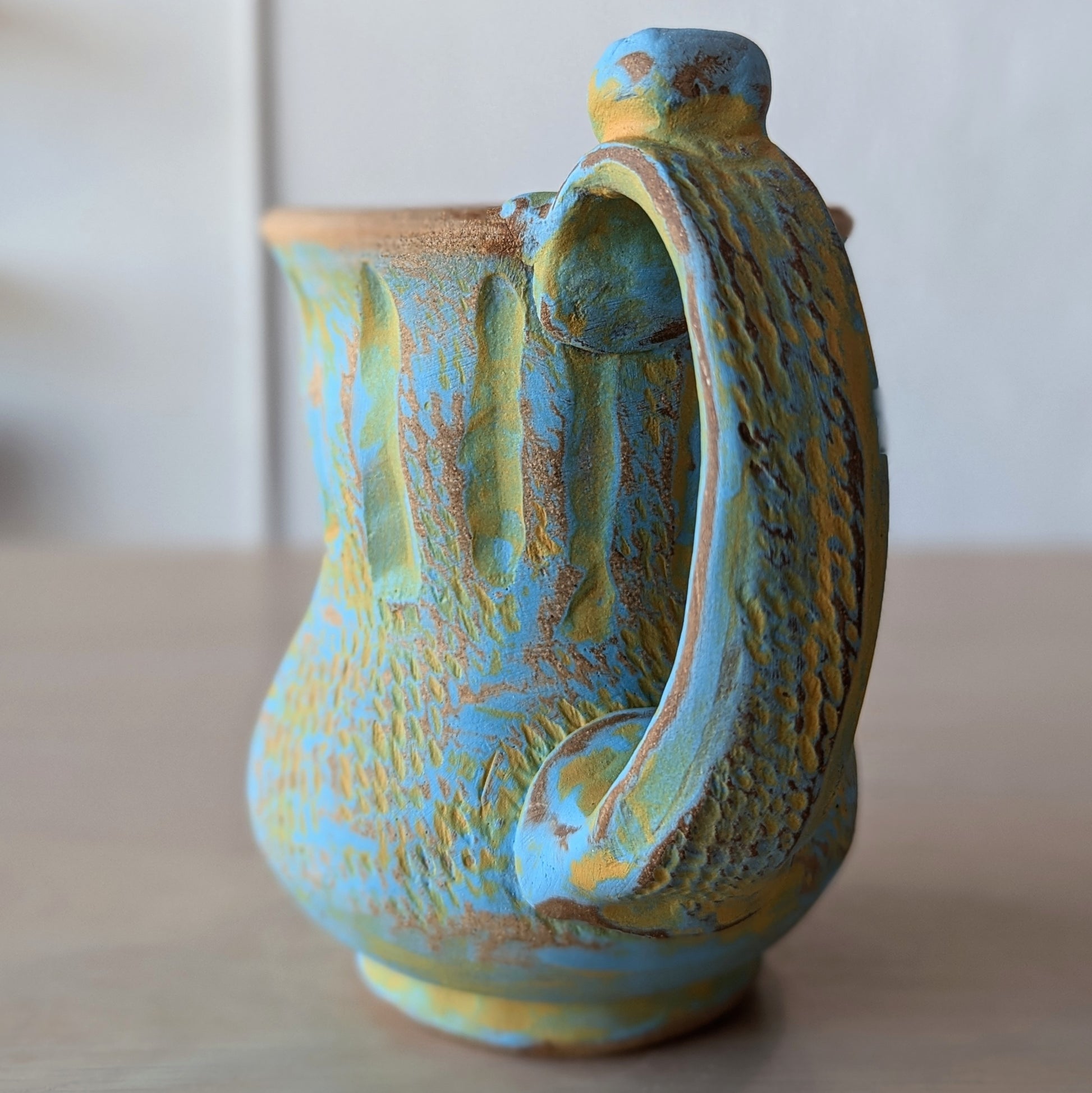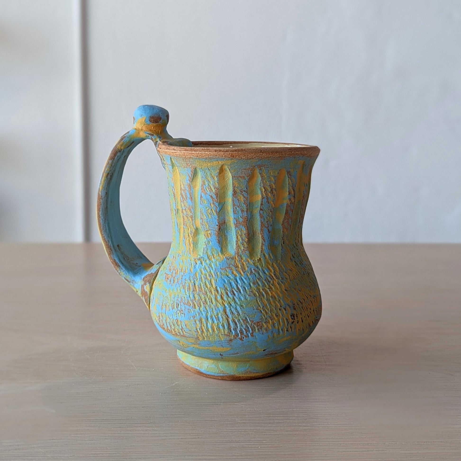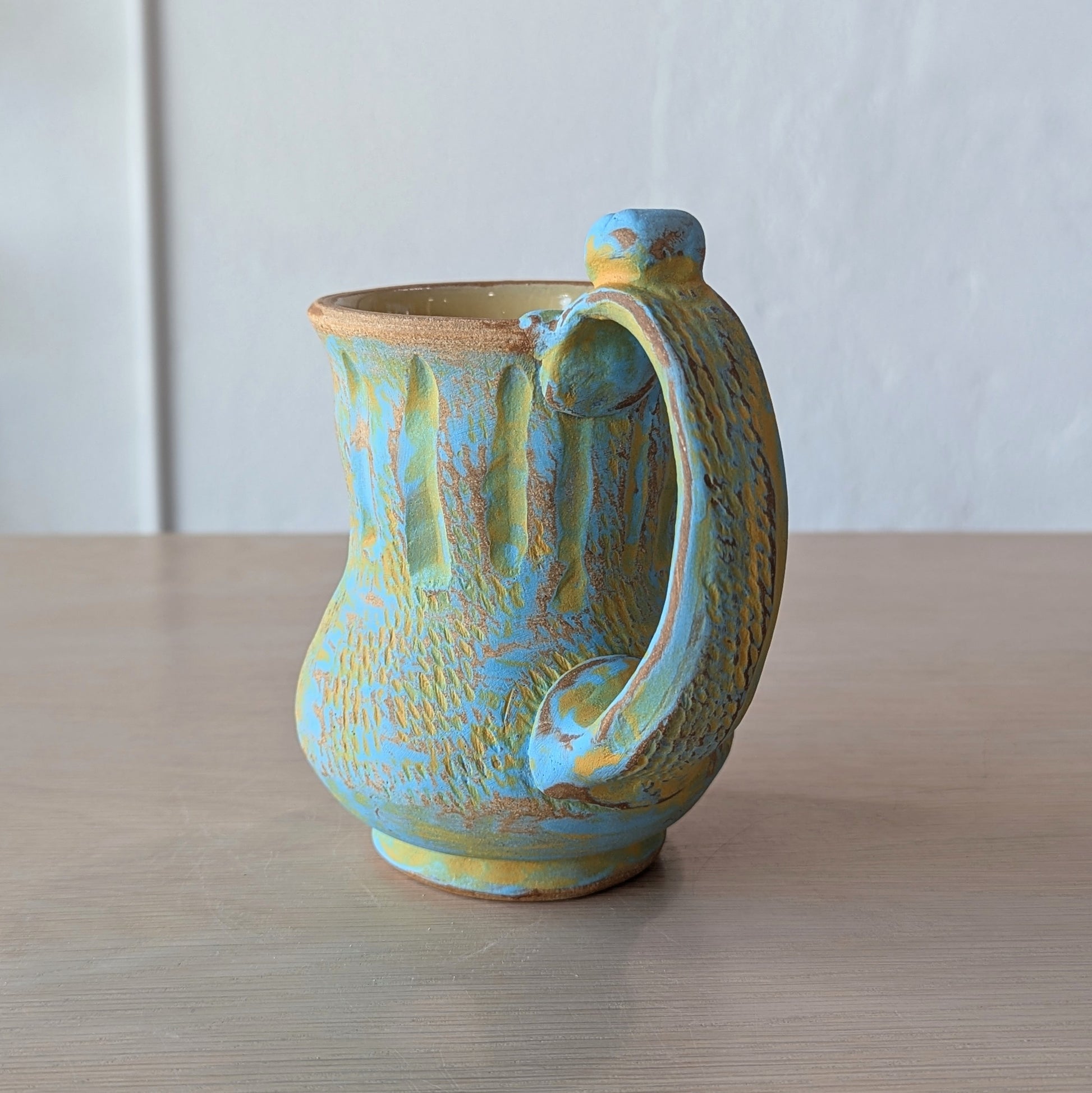 Hand-thrown and altered textured potbelly mug with a nub on the handle for a place to rest your thumb. Two colors (deep yellow, light blue), worn away using a specialized sanding technique.