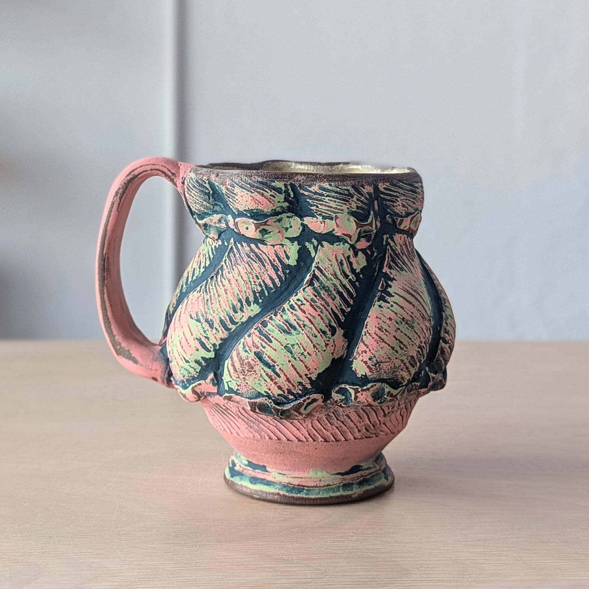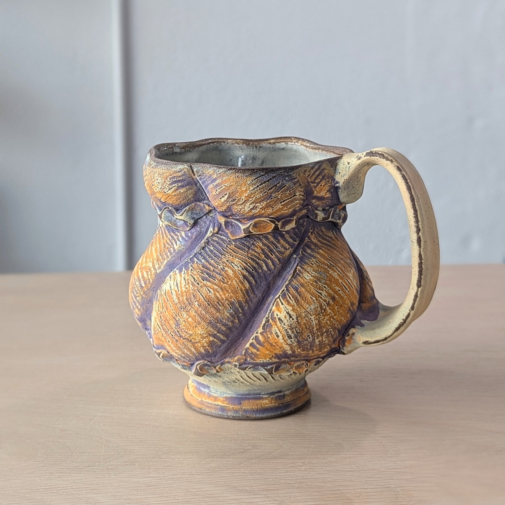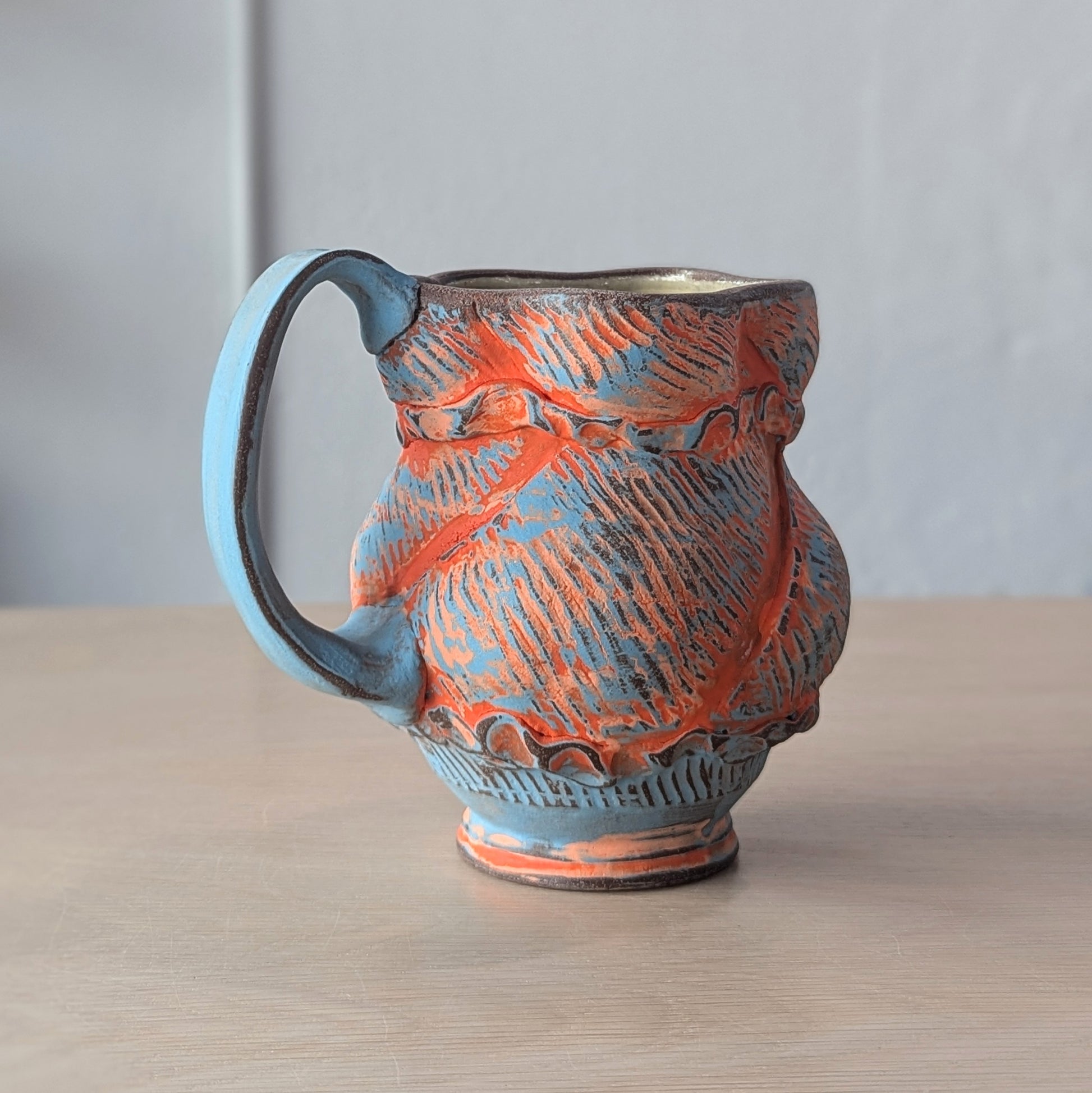 This hand-thrown and altered mug undergoes several glazing and firing rounds to achieve its complex depth and layered texture. Enjoy this functional sculpture with your daily cup of joe, tea, or favorite beverage.