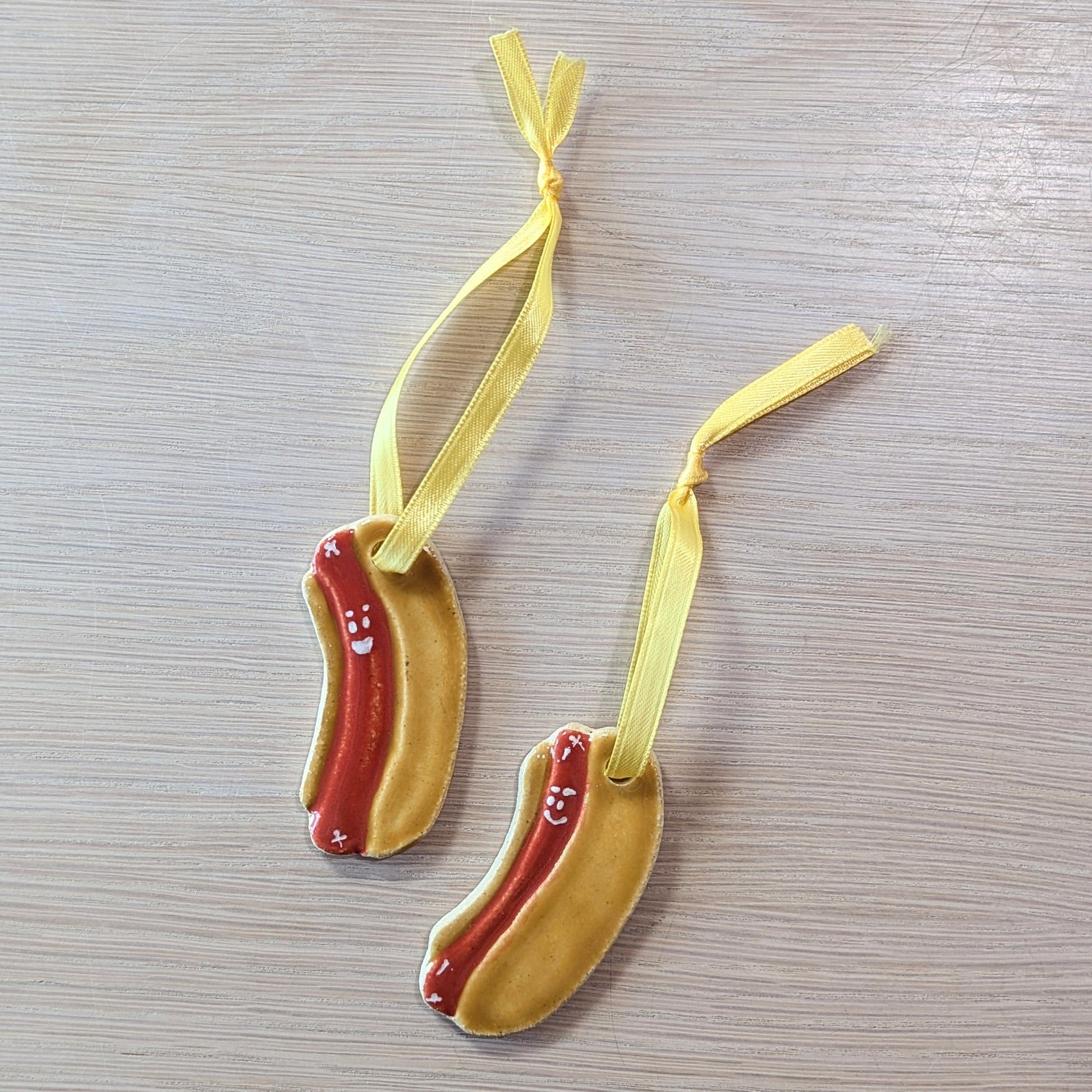 These handmade ornaments shaped like hot dogs will add the perfect whimsical touch to your tree or make an excellent white elephant gift. Available in plain, or with a stripe of mustard or a smiley face :)