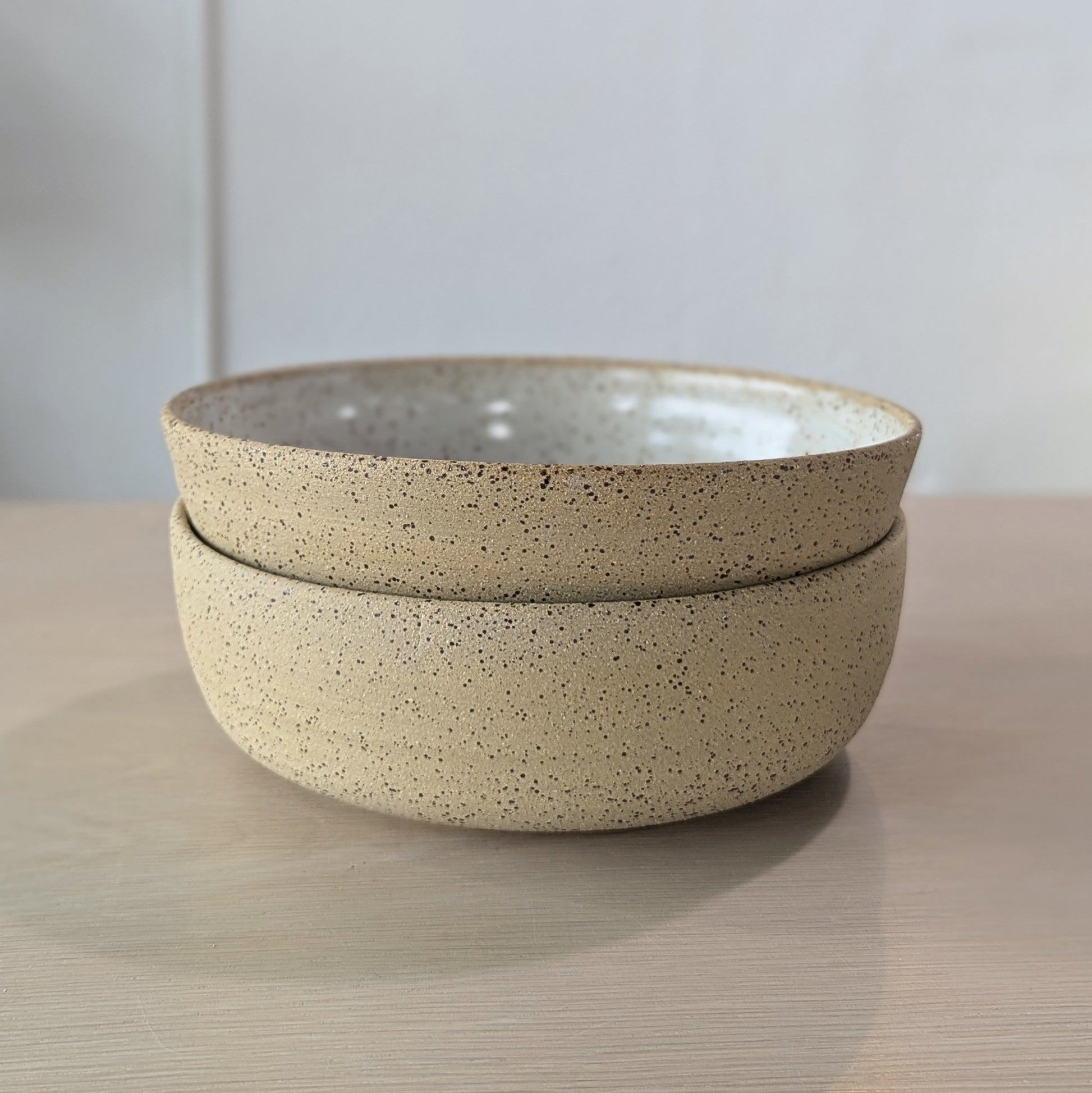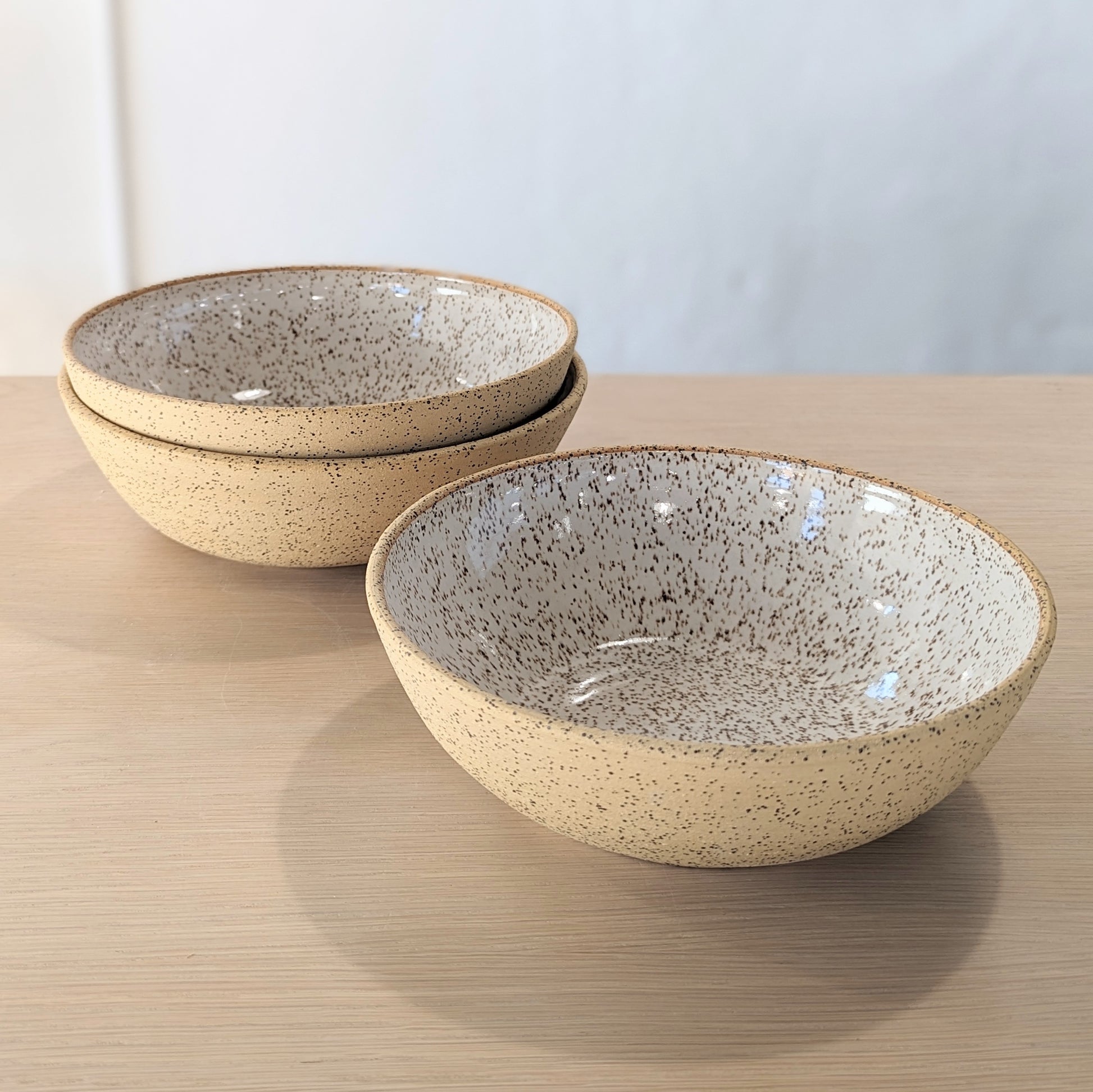 These stunning speckle bowls are lined with a smooth, milky-white glaze that gives them the perfect minimal lines and silhouette. They are spacious enough for pasta, salads, fruit-- the list goes on! Handmade in Waco, TX